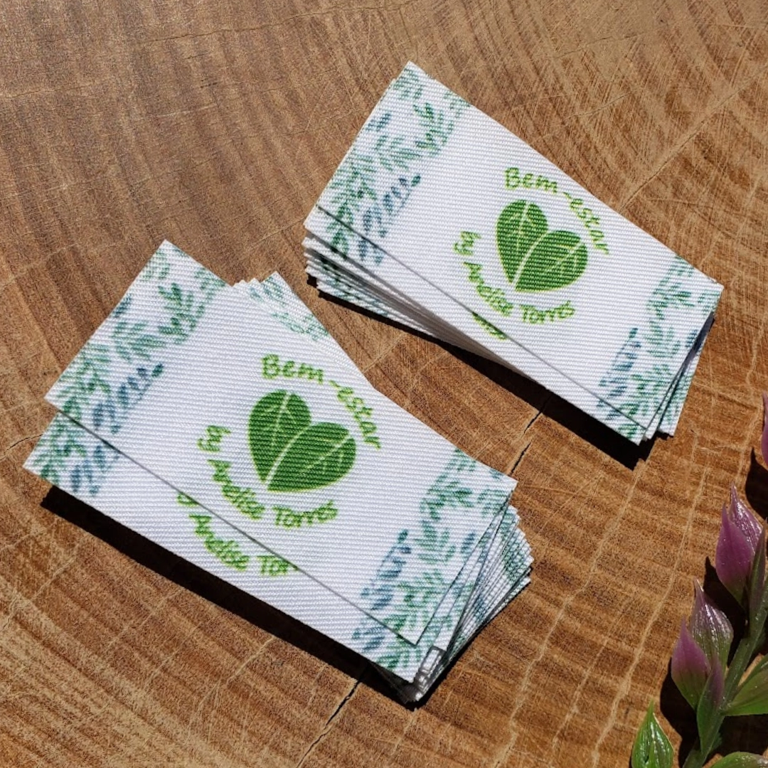 Etiqueta em tecido poliester, impressa termocolante com corte a laser.
